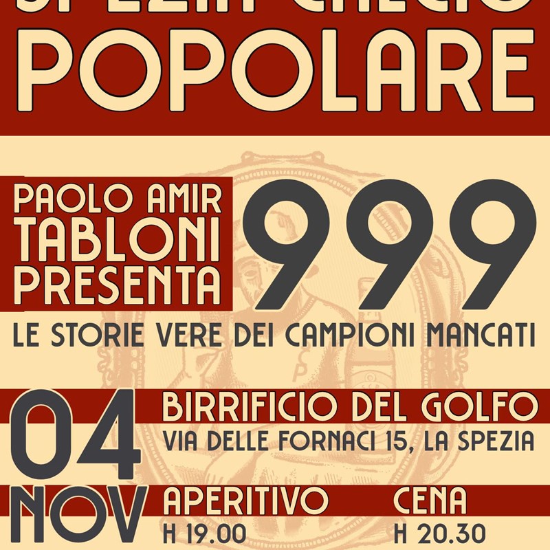 Venerdì 4 Novembre alle 21, Paolo Amir Tabloni presenterà il suo libro 999 al Birrificio del Golfo, in via delle fornaci 15, a La Spezia. Evento organizzato da Spezia Calcio Popolare. Cena su prenotazione.